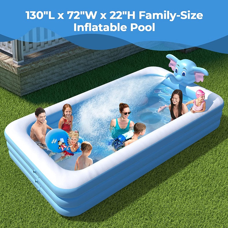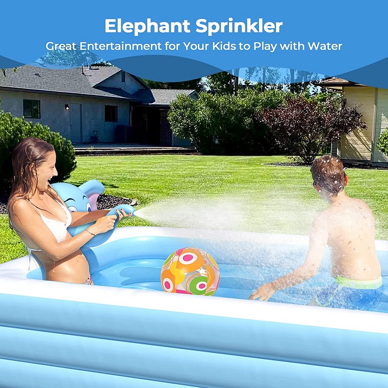 - Large Pool & Sprayer 2-in-1 Design: The elephant sprinkler can squirt out water to bring more fun for the kids. 130” x 72” x 22” large swimming pool not only provides a larger room for adults to lounge but also provides great entertainment for your kids to play with water.