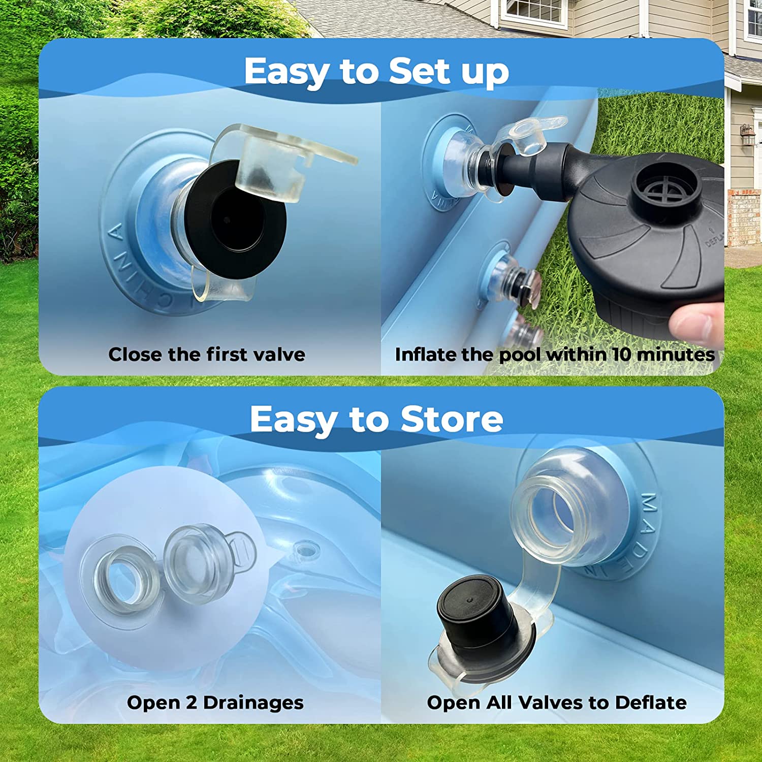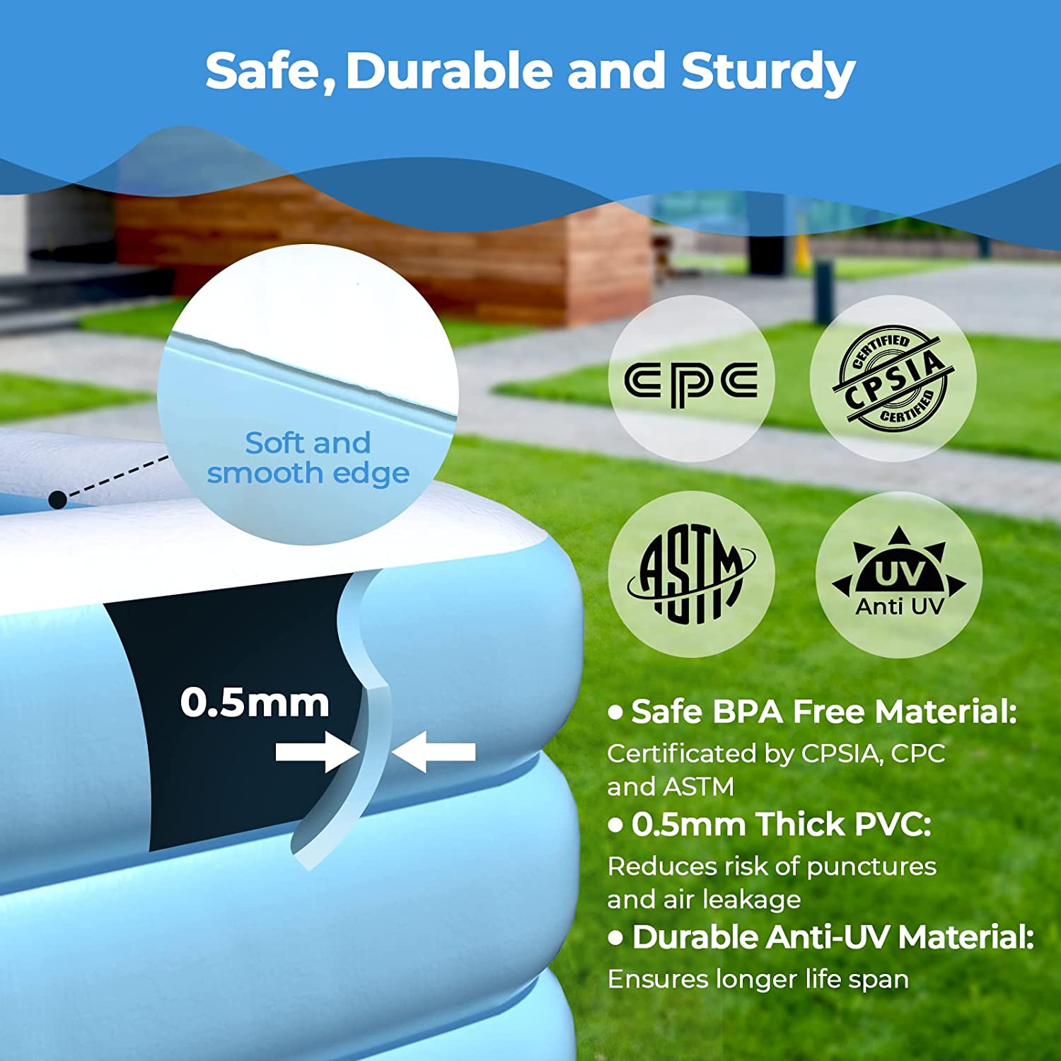 - ① Blow up pool for kids is made from Phthalate-free and lead-free PVC and certificated by CPSIA, CPC, and ASTM. ② 0.5mm thick PVC material reduces the risk of punctures and air leakage so you are available to enjoy the pool with pets. ③ Anti-UV materials are helpful to keep the inflatable pool for adults fresh under the sunlight, prolonging the life span of the kids swimming pool.