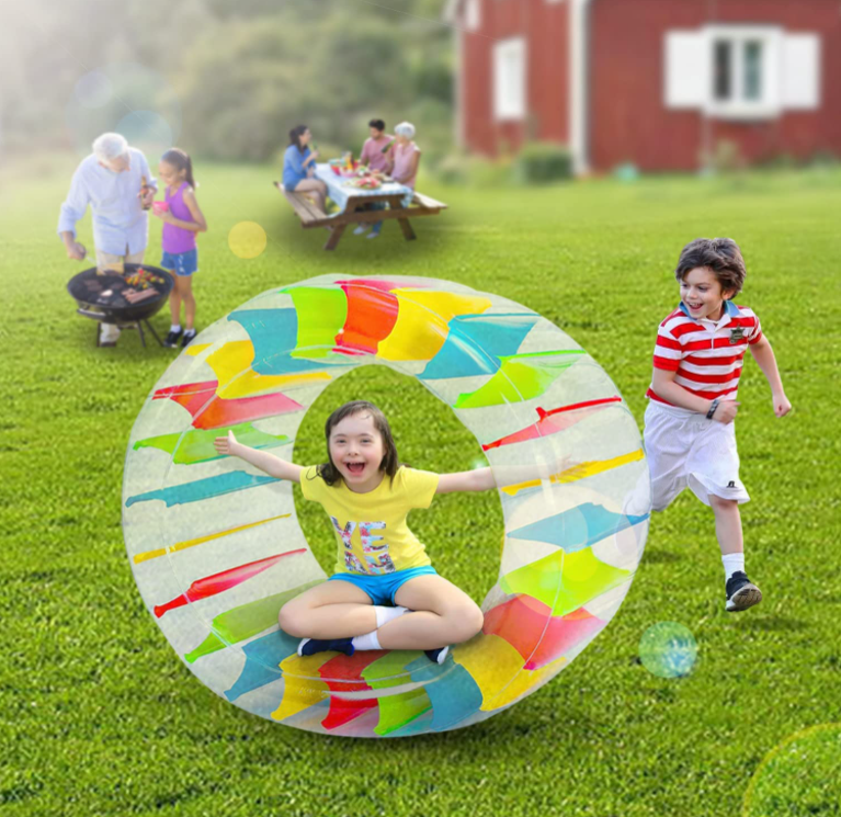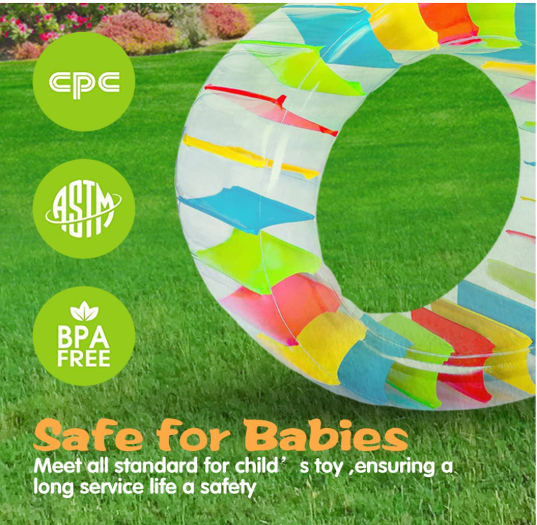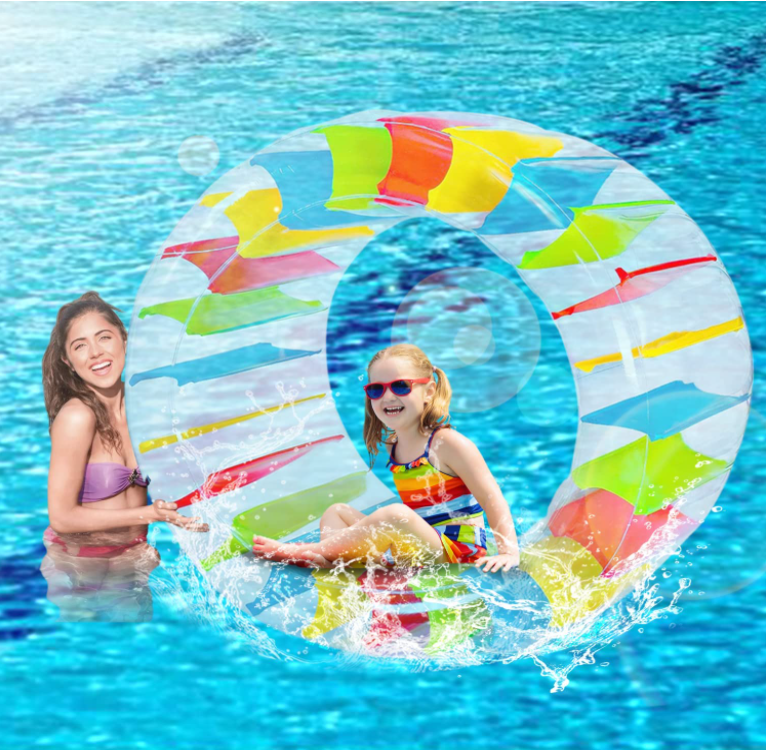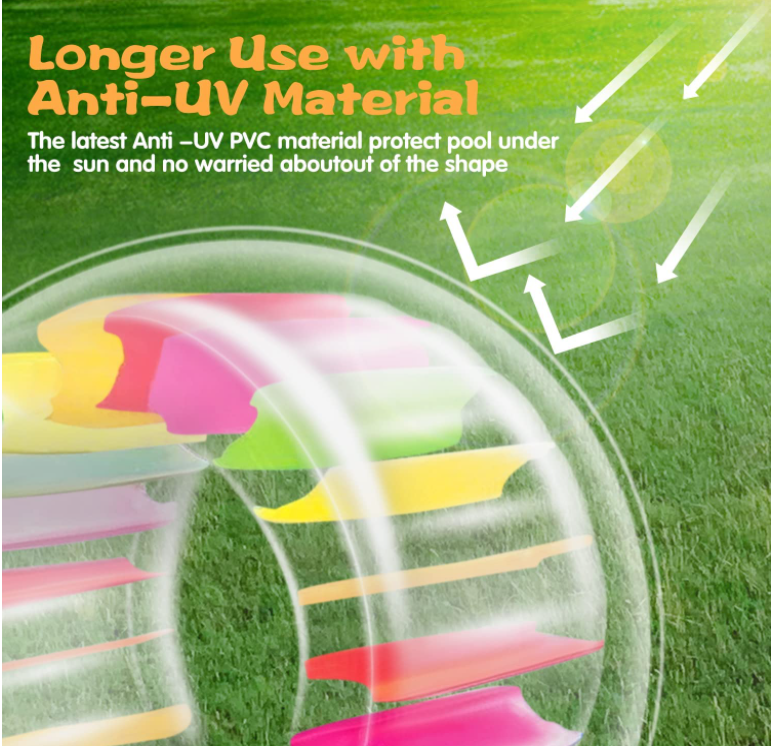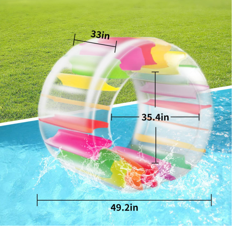 The built-in dual protection air lock prevent deflating from happening. With sturdy I-Beam construction and heavy duty PVC material, Roller Float is safe for kids to have a fun pool experience.Enjoy endless hours of summer fun at the pool, beach or lake with this giant inflatable colorful water wheel,Transparent clear shell adorned inside with colorful stripes, water wheel is great beautiful and impressing.