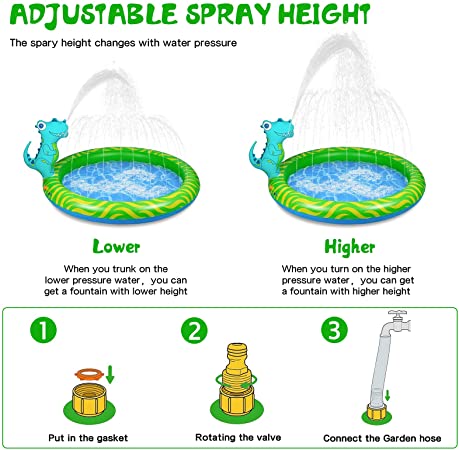 This sprinkler splash pad is 63″x 25.6″ x 7.1″ in size, which is a perfect size that can accommodate 2-3 children to play together. The splash pads are also great for kids to play with their parents. A lovely dinosaur cartoon image can stimulate the imagination of children, make children have more creative thoughts, and become more lively