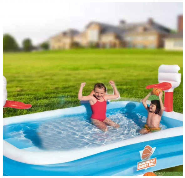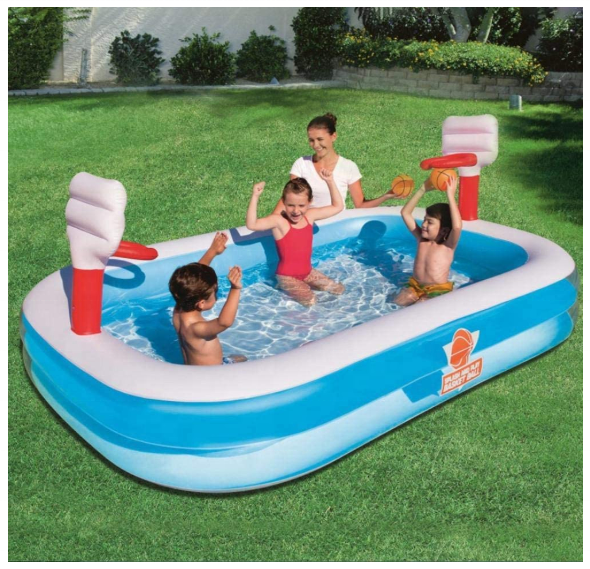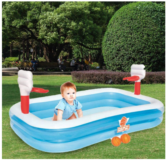 Inflatable pool and basketball stand. Children can bathe and play in it. Different inflatable layers increase its capacity. Perfect for the garden.